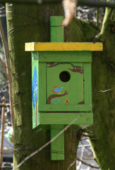 Vogelnistkästen gesägt, genagelt, bemalt und an den Bäumen